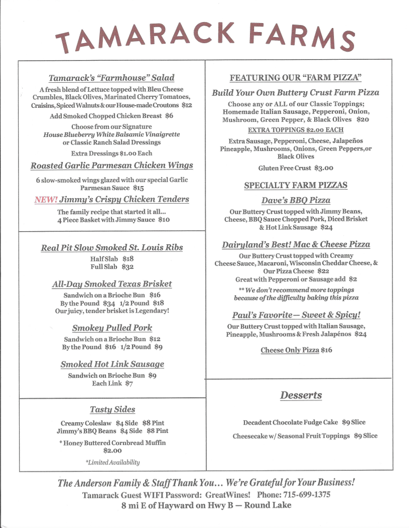 Tamarack Farms Winery offers a delightful selection of comfort food with a rustic twist, perfect for pairing with their wines. The menu features Tamarack's Farmhouse Salad, a fresh and vibrant option for those looking for something light. For pizza lovers, the Farm Pizza provides a hearty choice, bursting with flavor. If you're craving something savory and indulgent, the Roasted Garlic Parmesan Wings are a must-try, crispy and rich in flavor. For a more substantial meal, the Smoked St. Louis Style Ribs offer a tender, smoky experience, while the Slow Smoked Texas Beef Brisket is another standout, known for its deep flavors and melt-in-your-mouth texture. The menu showcases a strong commitment to flavorful, home-style cooking that pairs beautifully with the rustic charm of the winery.